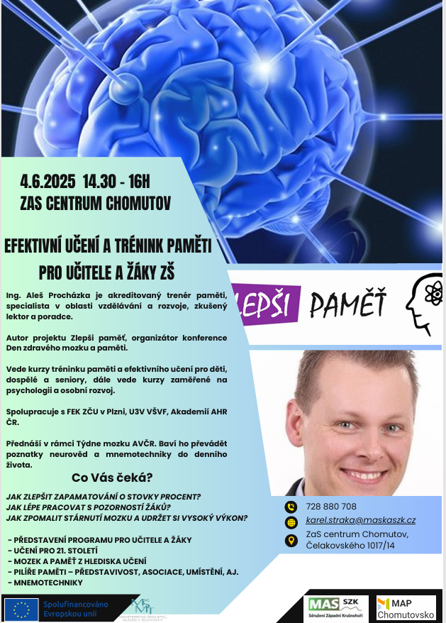 Jak zlepšit zapamatování o stovky procent? Jak lépe pracovat s pozorností žáků? Jak zpomalit stárnutí mozku a udržet si vysoký výkon? Srdečně Vás zveme na ukázkovou přednášku, kde budeme sdílet zkušenosti z oblasti trénování paměti a poznatky neurověd pro moderní pedagogiku. Představení programu pro učitele a žáky, Učení pro 21. století, Mozek a paměť z hlediska učení, Pilíře paměti – představivost, asociace, umístění, aj., Mnemotechniky